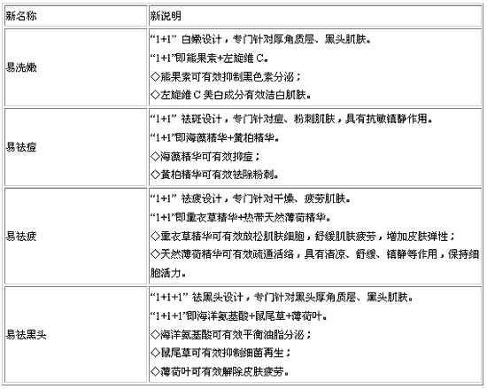 其次,是產(chǎn)品線的調(diào)整;麅z產(chǎn)品針對不同皮膚問題有十幾個品種,但每個產(chǎn)品在功能、訴求概念、產(chǎn)品說明等方面都沒有清晰的差異特點。為此,我們根據(jù)最常見的皮膚問題選擇了四款產(chǎn)品進(jìn)行重新整合,首先是產(chǎn)品名稱,原來的名稱存在概念不清晰的問題,我們分別把4款產(chǎn)品進(jìn)行了更加清晰的命名:易洗嫩、易祛痘、易祛疲、易祛黑頭。同時,對產(chǎn)品的功能說明也進(jìn)行了重新整合!