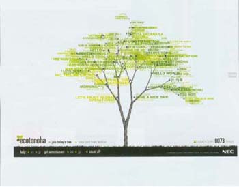 作品評析:Ecotonoha是一個如用戶參與植樹的網站。此次的宣傳戰役讓人們用寫信息的方式,共同在網上創造一棵大樹。隨著用戶信息的增長,樹葉也在增長,樹在不斷長大。NEC為每一百名用戶,在澳大利亞Kangaroo島種上一棵樹。去年7月14至12月25日活動期間,NEC共獲得了609棵樹的植樹計劃。NEC希望通過此次活動,全面提升日本信息技術領導者的公司形象。