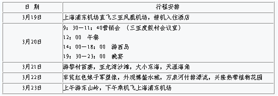 我們的想法是,3月19日客戶全部抵達(dá)三亞后,經(jīng)過(guò)一個(gè)晚上的休息,第二天精神抖擻,正好適合召開(kāi)營(yíng)銷會(huì)議。所以我們對(duì)3月20日上午的營(yíng)銷會(huì)議進(jìn)行了精心設(shè)計(jì)。