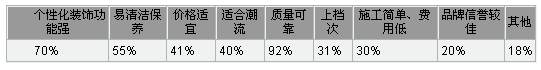 從上表中可看出,消費者在選擇建材家居產品的時候,會將易清潔、耐用、經濟等原始功能與個性化裝飾效果、時尚潮流、高檔等體現個人愛好與品位檔次的需求,雙重結合起來一同考慮。