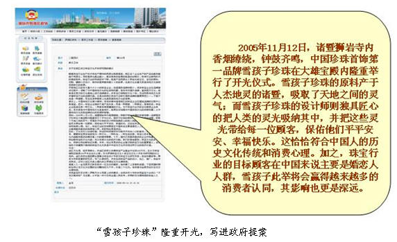 于是,我們就成功確定了“雪孩子”珍珠品牌的方向:“雪孩子”是中國傳統(tǒng)文化的積極發(fā)揚者,是中國珍珠業(yè)的中堅力量,是中國珍珠復興的忠實擁護者和領(lǐng)導者,是中國珍珠復興的旗幟和標桿。