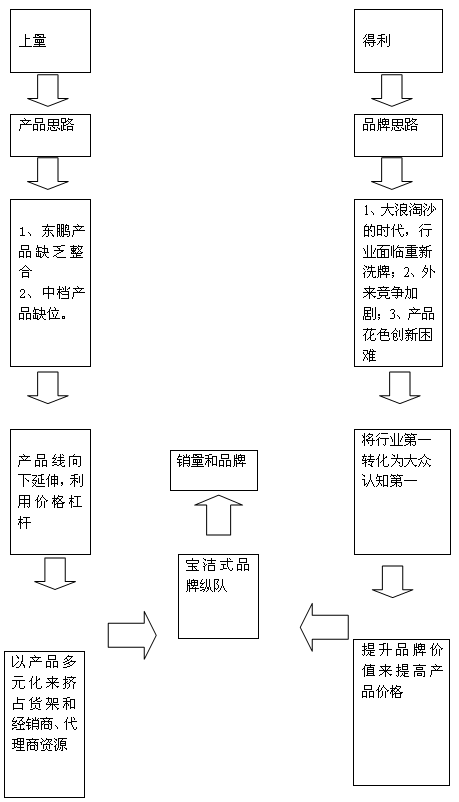 我提出東鵬的策劃思路:通過產品整合和品牌推廣兩條腿走路的方式,全面提升東鵬銷售力。其核心問題是品牌不力導致產品銷售困難,區域市場難突進,因此只有將行業第一的知名度,通過大眾媒體傳播轉換為大眾認知的第一,即將“專業第一”轉換為“品牌第一”,提出“中國建陶第一品牌”的定位(這里與企業已不謀而合,東鵬已提出“打造中國建陶第一品牌”的口號),形成有利的第一階梯領袖定位的心智認同。同時按寶潔方式以“東鵬榮譽出品”來整合形成子品牌縱隊,以產品多元化來擠占貨架和經銷商、代理商資源。通過提升品牌價值,降低產品價格來上量和得利。