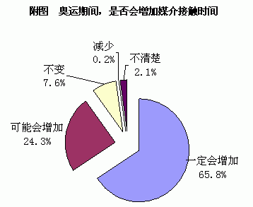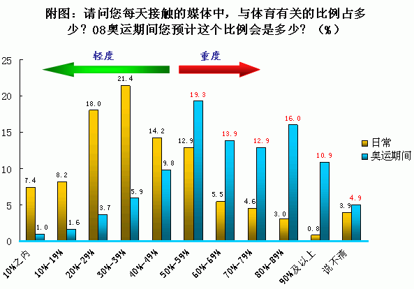 調(diào)查發(fā)現(xiàn),08年奧運(yùn)會(huì)勢(shì)必會(huì)帶來受眾媒體消費(fèi)的突飛猛進(jìn),奧運(yùn)期間體育相關(guān)的媒介內(nèi)容需求增長(zhǎng)強(qiáng)勁,重度接觸媒體的比例則呈現(xiàn)出巨幅增長(zhǎng)的格局。首先是平常不看體育的人會(huì)在奧運(yùn)期間開始關(guān)注相關(guān)的媒介信息,加入輕度消費(fèi)群體;另一方面,本來輕度或中度的體育內(nèi)容消費(fèi)者也在奧運(yùn)期間呈現(xiàn)出向重度消費(fèi)陣營(yíng)轉(zhuǎn)移的趨勢(shì)。