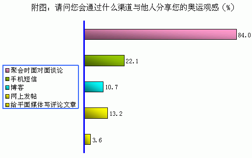 而很多受眾也對(duì)于積極利用新興媒體表示出積極的態(tài)度,奧運(yùn)的巨大感召力讓受眾利用網(wǎng)絡(luò)媒體和移動(dòng)媒體進(jìn)行溝通、表達(dá)和傳播的欲望也將迸發(fā)出來,而手機(jī)的移動(dòng)性、網(wǎng)絡(luò)的互動(dòng)性價(jià)值在奧運(yùn)受眾群中得到充分發(fā)揚(yáng)。調(diào)查顯示,22.1%的受訪對(duì)象表示將通過手機(jī)與他人分享奧運(yùn)觀感,這個(gè)數(shù)字實(shí)在是讓人眼前一亮,而10.7%的人會(huì)在奧運(yùn)期間上傳博客,可以預(yù)見奧運(yùn)勢(shì)必帶來新一輪的網(wǎng)絡(luò)博客熱潮。