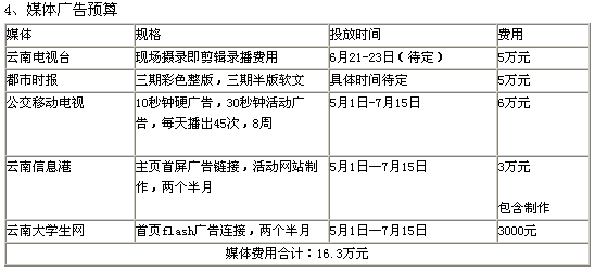 報名宣傳:大學校園10個報名點,每個點場地及人員預算1000元。社會2個報名點;每個點場地及人員預算2000元。合計1.4萬元
