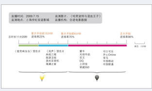 受眾的購買力:可以從圖表中看出,在影片放映前的6分鐘分別有:蒙牛、花王、光明、DQ、上好佳、榮威、可口可樂、開心online、寶馬、移動、聯通;就《哈6》的受眾群體來說正是這些產品的主力消費軍,具有一定的購買力,因此,諸如此類的廣告是傳播效應最高的。