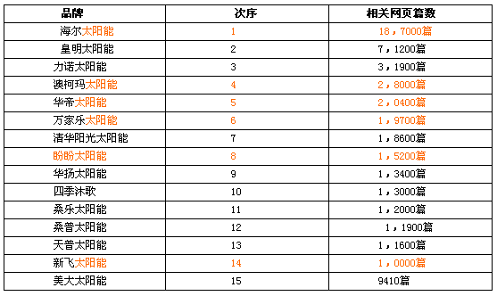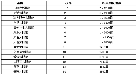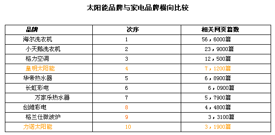太陽能品牌百度網絡搜索(含傳統太陽能品牌與家電企業太陽能品牌在內)