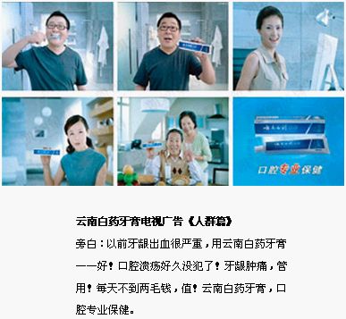 白藥健康產品事業部黃衛東總經理的衷心期許,更寓示著云南白藥牙膏,征戰中國口腔市場,為13億國人帶去口腔健康的野心、使命與夢想…… 一個月前的北京,已有了深冬的寒意,在一個臨郊的攝制基地里,上海凱納營銷策劃機構的沈國梁總經理正與影視名人濮存昕、北京電影學院的導演做著簡短而熱烈的探討,這條08年即將投放市場的云南白藥牙膏廣告片,未開拍即已吸引各方關注的目光,而在拍攝現場忙碌的凱納云南白藥專案組成員更是清晰地感受到,云南白藥牙膏的春天臨近了……