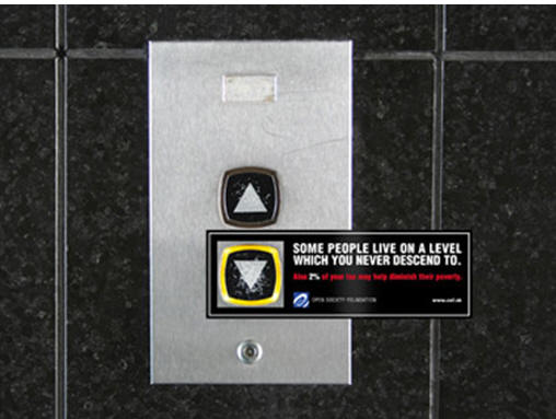 下面這幅作品是由捷克斯洛伐克的Mayer/McCann-Erickson公司為OSF基金會(the Open Society Foundation)創作的募捐廣告。廣告語是“一些人生活在你從來沒有去過的(社會)底層”。廣告就發布在電梯按鈕的下行鍵上,既醒目又一語雙關,很有新意也很有深意。不過,廣告主題稍欠缺乏說服力。