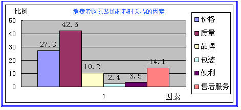 消費者對建材類產品關心的重點是在產品質量(占比42.5%)方面,對于如此專業方面來說,非專業人士只能憑感覺及別人的推薦才選擇質量好的產品。