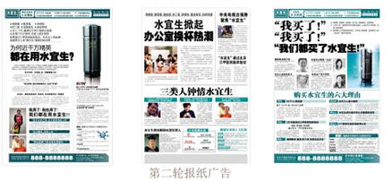 上市之初,主要以中老年人和辦公室人群為主要訴求對象,通過描述他們使用之后的好處,來驅動這部分人群購買,同時加強了理性說服,用科學的語言來解釋水宜生制出的水有什么好處,進而讓消費者相信,產生購買欲。對此,我們推出了一系列的報版,標題如下:
